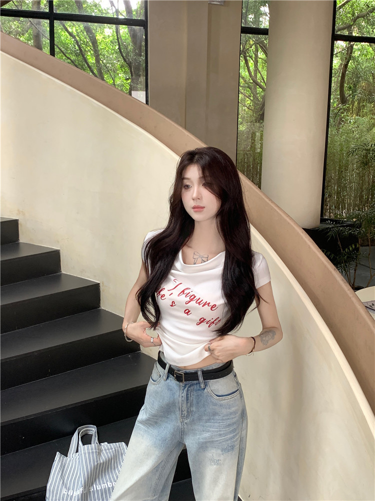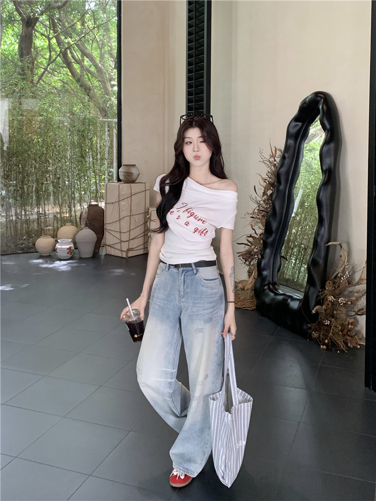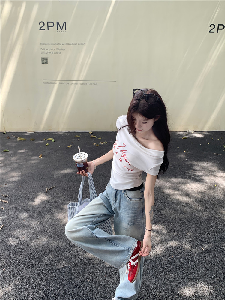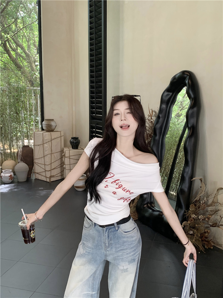 One Shoulder Short Sleeve Fitted T-Shirt for Women Letter Print Slim FitCrop Top Off-Shoulder Casual Blouse